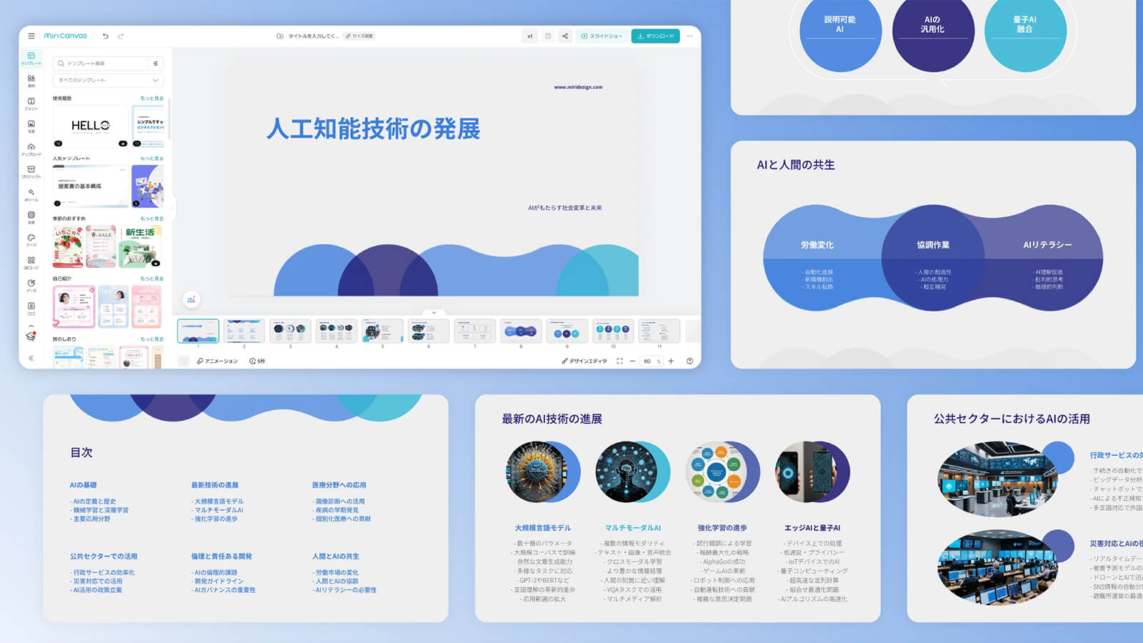 AI機能はプレゼン生成だけにとどまりません。画像生成・動画生成・文章作成・背景除去・高画質化まで、「miricle AI」と呼ばれるAI機能群がひとつのエディタ内に集約されています。外部ツールを行き来する手間なく、資料制作の全工程をブラウザひとつで完結できます。