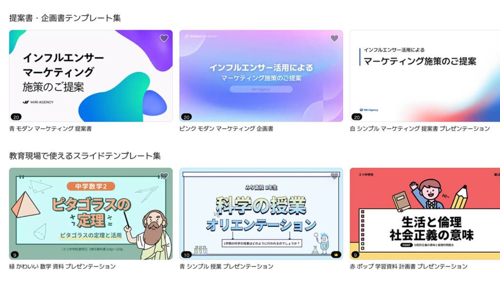 MiriCanvasは日本市場を意識した展開をしており、清潔感のあるレイアウト、適切な情報密度、誠実な印象を与える日本語フォントが揃っています。53万個以上あるテンプレートの中から、ビジネス資料として即使えるものをすぐに見つけられます。