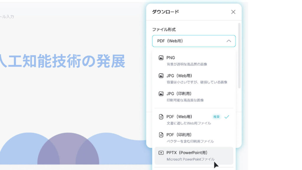 出力はPPTX形式に対応しており、PowerPointで開いてもレイアウトが崩れず、そのまま再編集できます。先方がPowerPointしか受け取れない、という場面でも心配がありません。