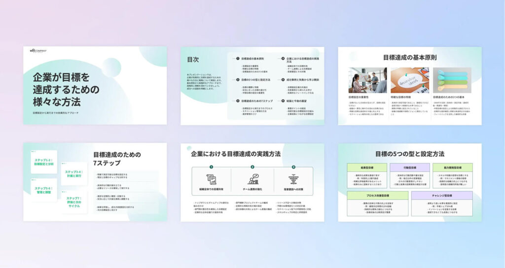 「AIが作ったスライドなんて、どうせ使い物にならない」という印象を持っている方は、まだ実際に触ったことがない方です。MiriCanvasのAIプレゼン機能は、トピックを入力すると数十秒でスライド構成を提案し、デザインが適用された状態で出力されます。