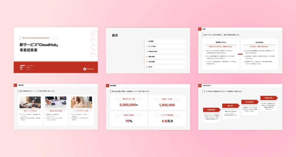 デザインツールの比較記事でよく見落とされるのが、テンプレートの「空気感」です。海外発ツールのテンプレートは視覚的に派手でカラフルなものが多く、日本の営業資料や社内報告書には浮いてしまうことがあります。それを日本向けに整え直す手間が、見えないコストとして積み上がっていくわけです。