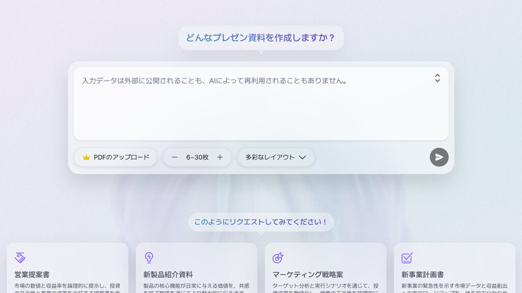 重要なのは、生成後にすべてのテキスト・画像・レイアウトを自由に編集できる点です。AIが作ったものをそのまま使うのではなく、「自分の言葉に直す作業だけに集中できる」という設計になっています。従来の資料作成とは順番が逆です。ゼロから積み上げるのではなく、削って磨いていく流れに切り替わります。この違いが、作業時間を体感レベルで縮めます。