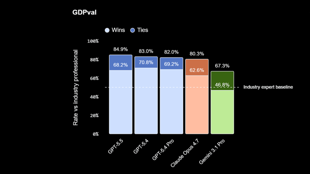 ただし、全ての指標でトップではありません。GitHubの実際の課題解決を評価するSWE-Bench Proでは、Claude Opus 4.7が64.3%に対しGPT-5.5は58.6%と負けています。ツール活用能力を測るMCP Atlasでも、Claude Opus 4.7(79.1%)とGemini 3.1 Pro(78.2%)に75.3%で及びません。44職種にわたる実務タスクを評価するGDPvalは84.9%で、前モデルの83.0%からほぼ横ばいです。つまり、エージェントや数学領域での伸びは本物ですが、日常の幅広い業務での体感は劇的には変わらないかもしれません。